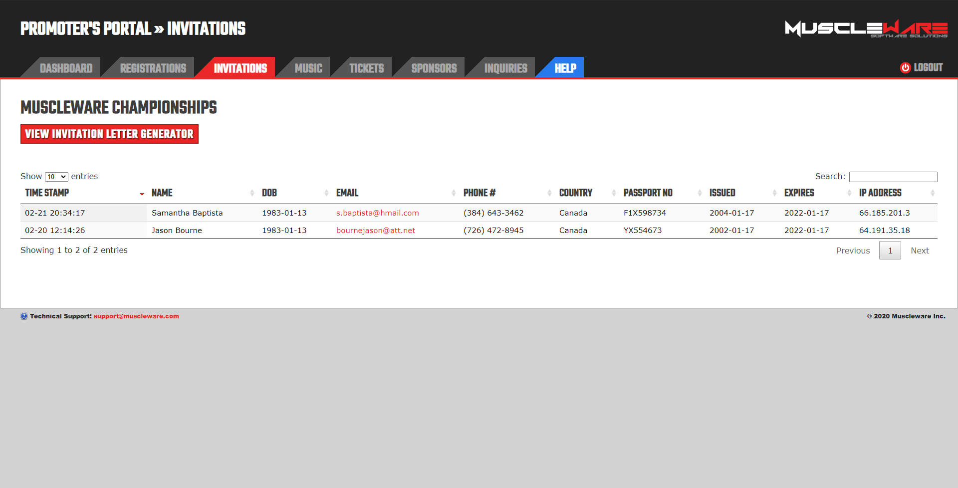 Rather than creating invitation letters manually, taking time and attention away from other things, Promoters can enable Muscleware's automatically generated international Athlete invitation letters module. With this feature, Athletes can fill out a Muscleware form that instantly generates a professional printable letter for the Athlete, customized with your event details, logo and even your signature.