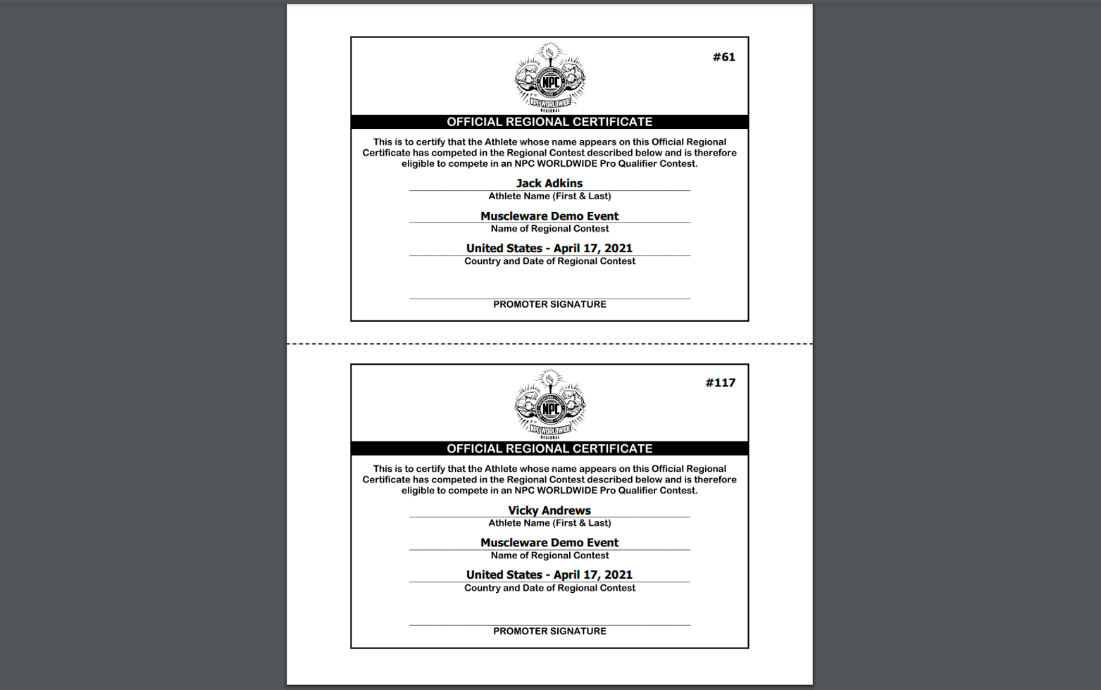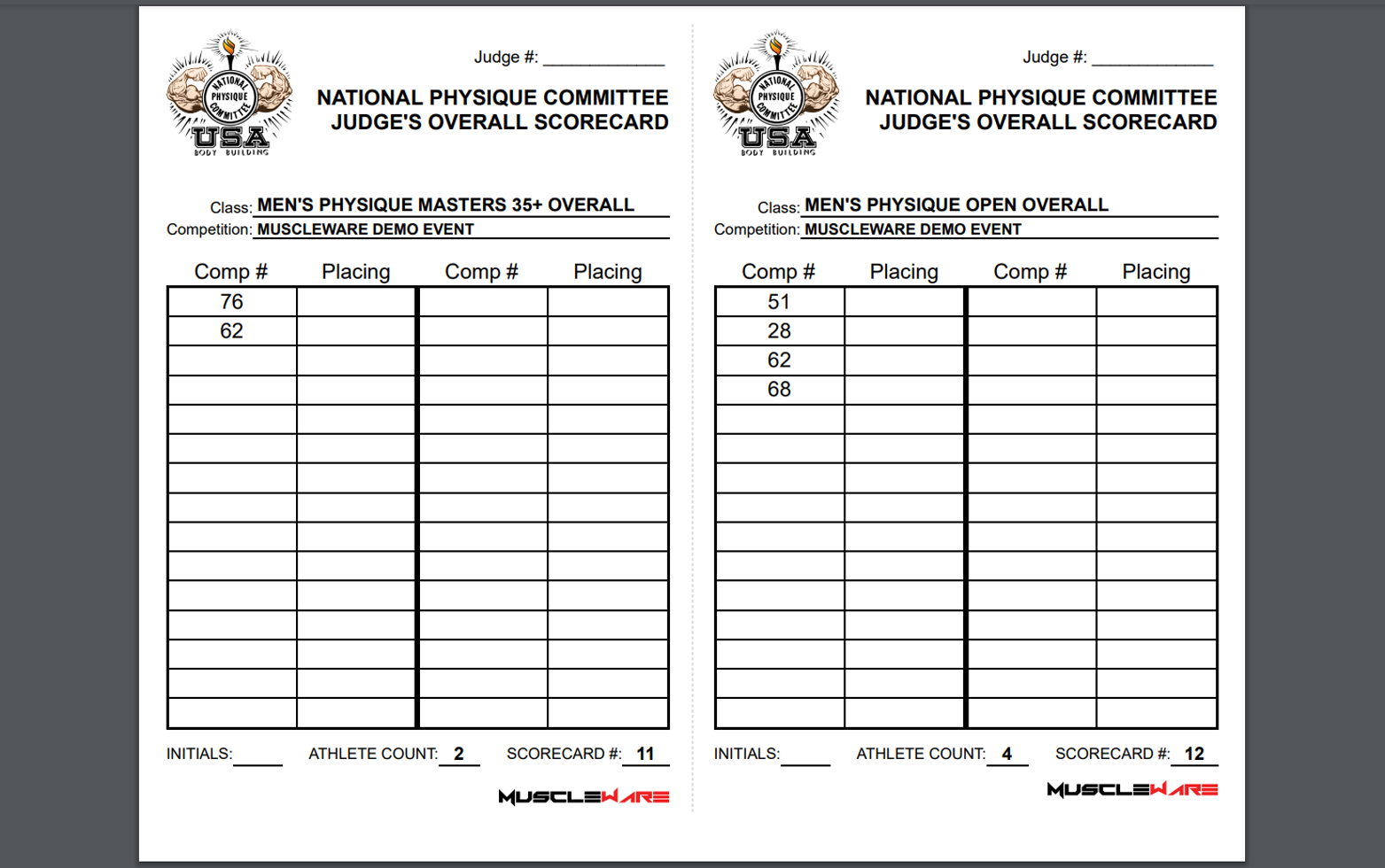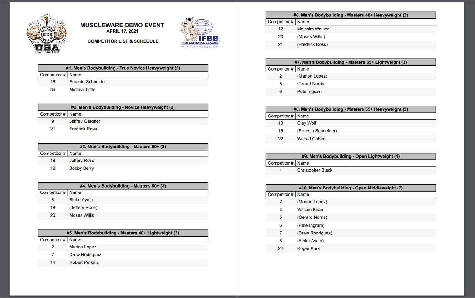 Muscleware Event Files are created with all kinds of intelligence built in. For instance, the file knows what organization the event has been sanctioned under (IFBB Professional League, NPC, NPC Worldwide, or CPA) and therefore what logo(s) to display on Created Documents.