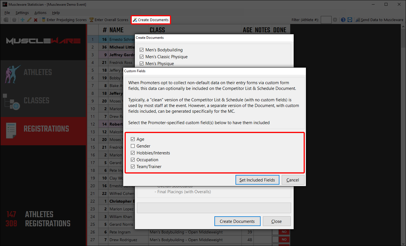 Athlete Bio Sheets - If Promoters have instructed Muscleware to collect custom/non-standard data on event entry forms (such as Occupation, Trainer Name, Gym, etc.), there is a selector in the "Create Documents" dialog that allows Statisticians to select the relevant data fields for inclusion on the Competitor List & Schedule. This document, if re-generated for the Finals portion of the show, can be used as a supplemental document to the MC Sheet, allowing the MC to make personalized Athlete announcements. For more information, see Section 6.5.3