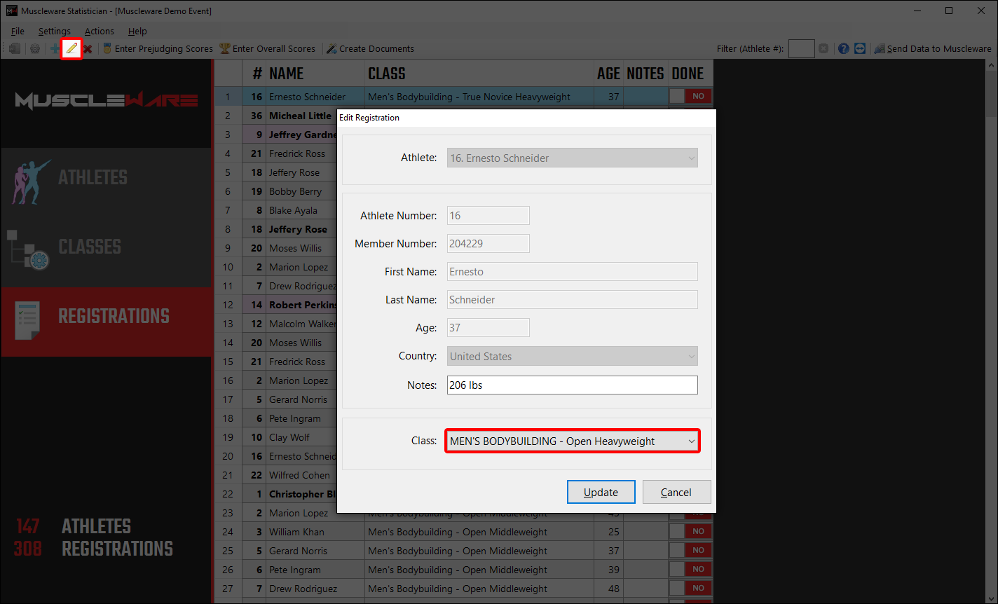 Edit dialogs for the "ATHLETES", "REGISTRATIONS", and Statistician-defined "CLASSES" can be accessed by simply 'double-clicking' the rows.