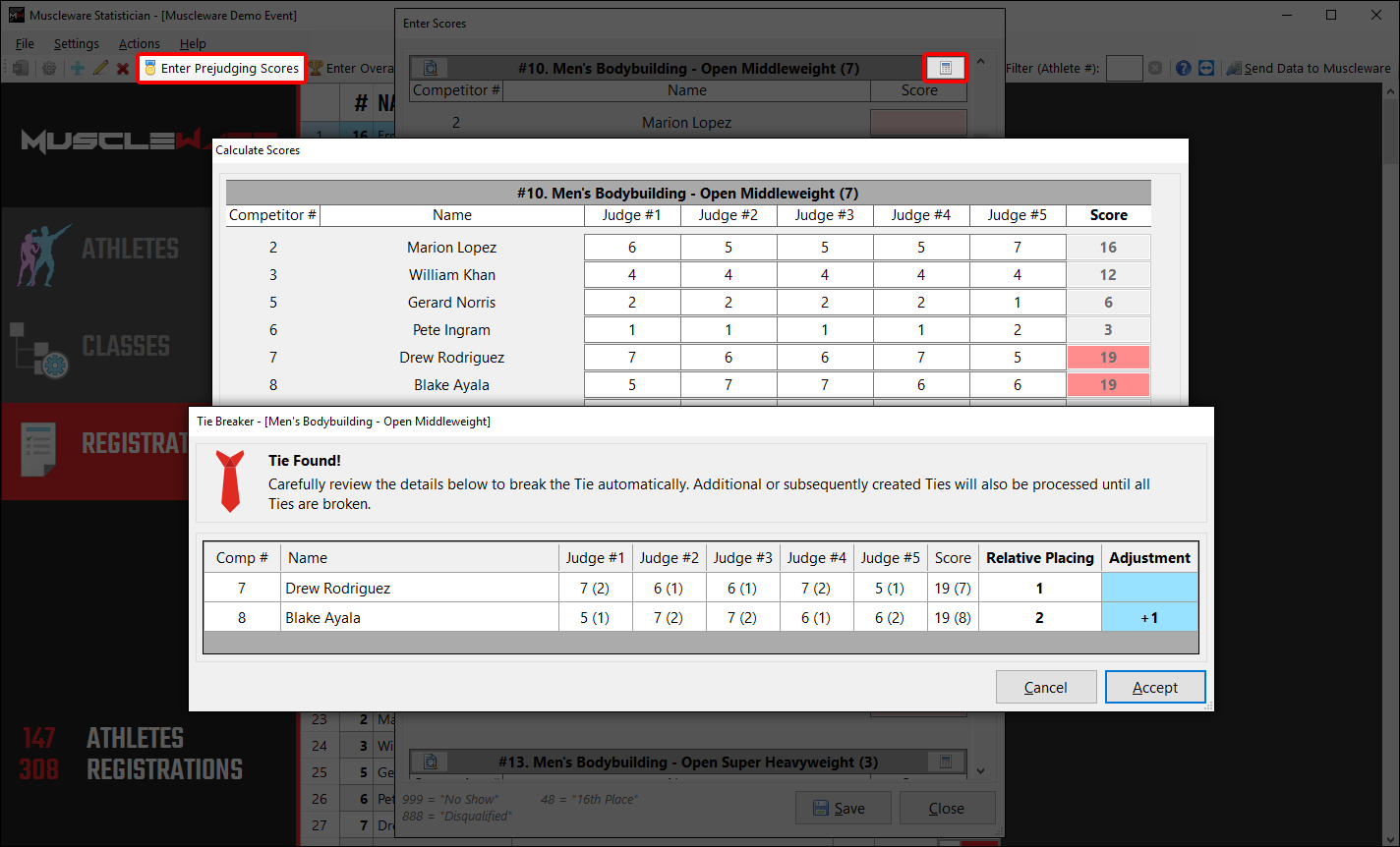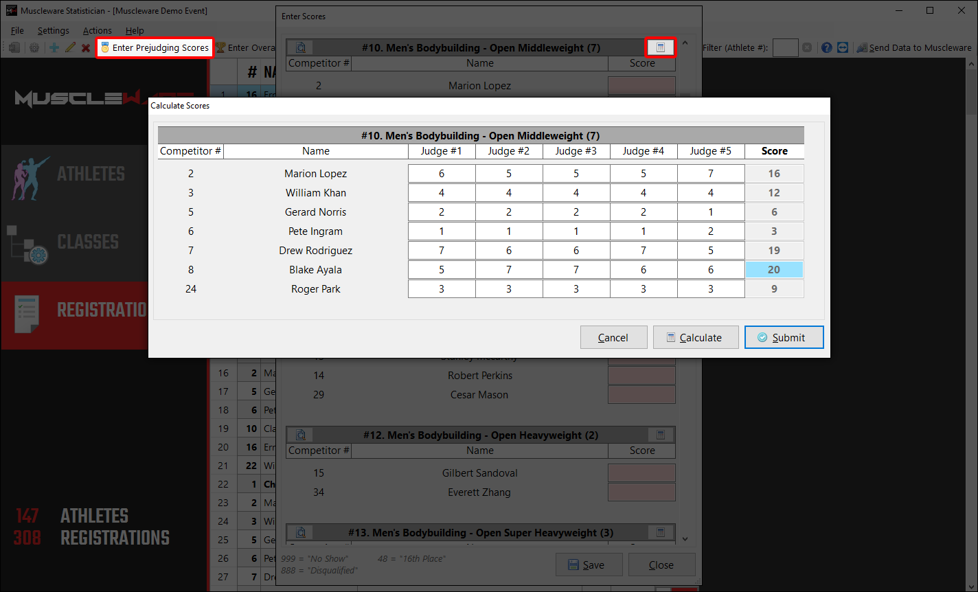 Updated IFBB Pro League / NPC Fitness Scoring procedure and calculations are now supported. In the 'Enter Prejudging Scores' dialog, there are two calculators - one for Round 1 (Two Piece), and a second for Round 2 (Routine). Only when both rounds are entered and calculated will the Prejudging scores be calculated and weighed, per NPC specification.