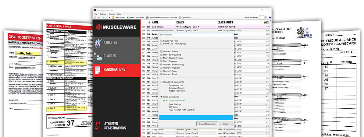 Muscleware Statistician includes a score calculator and produces Athlete Lists, Scorecards, Crossover Reports, an innovative "MC Sheet" and more with the click of a button, respecting all changes / updates made to athlete data
