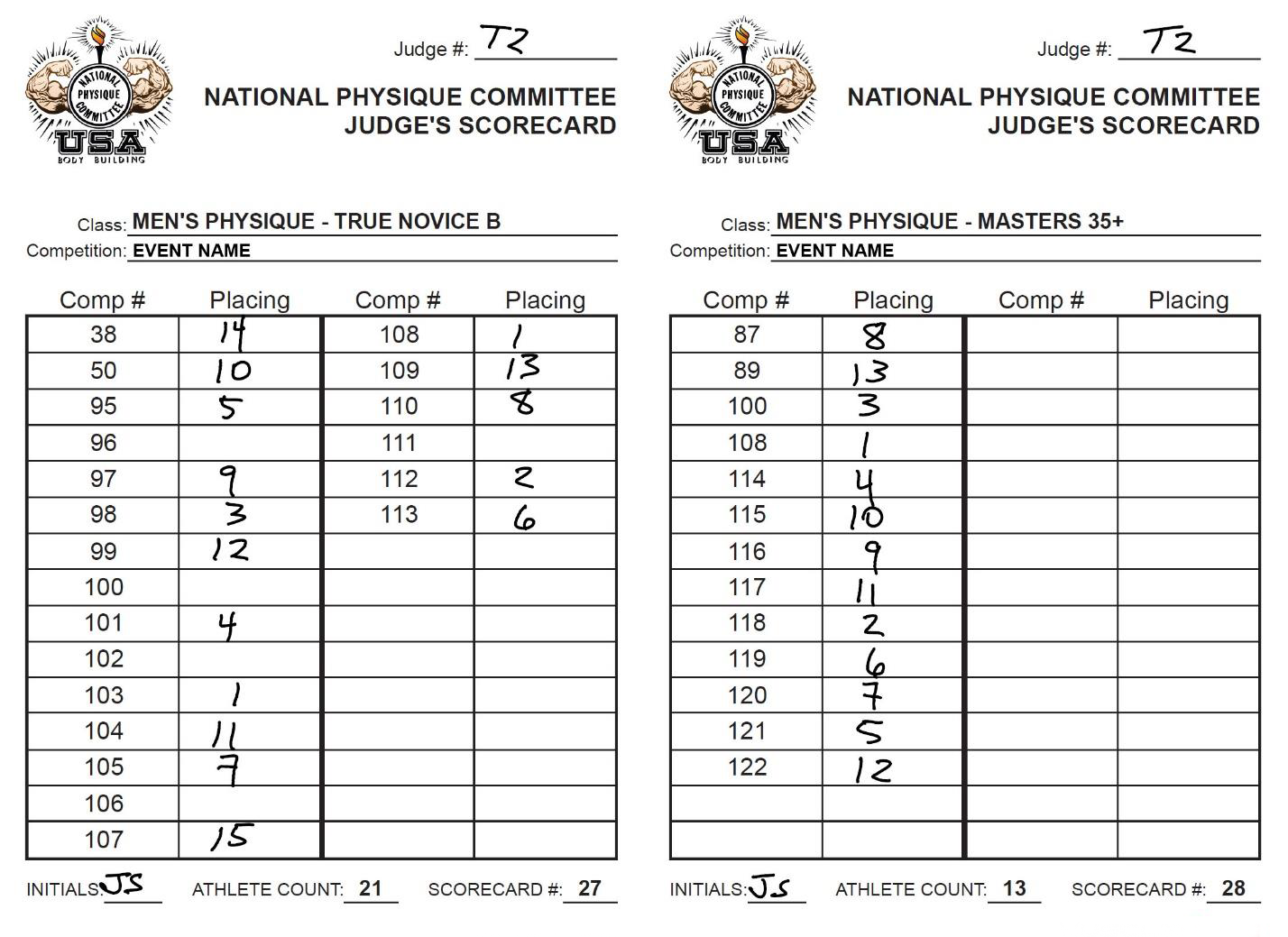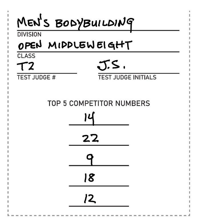 Becoming an NPC Judge is a prestigious honor that brings with it significant responsibility. Professional and accurate Judging of Athletes is of the utmost importance to the NPC. As such, we hold our Judges to the highest standard. Test Judging is an integral part of our training and evaluation process. Good luck at your upcoming Test Judging! General Notes Test Judging involves two separate evaluations; A "Top 5" test, as well as a "Total Class" test. Each is described below, including what you will need, and how and when to turn in your scores. 1. Top 5 Test (for Classes with 8 or more Competitors) For each class with 8 or more competitors, you will complete a "Top 5" card after the Competitor presentations, but before the Head Judge makes the first callout. An example of a "Top 5" card is below: ![]() Each "Top 5" card must be completed entirely, including your Test Judge Number (which the Event Statistician will provide to you before the beginning of the Event), your initials, the Division (e.g., "Men's Bodybuilding", "Women's Physique", etc.) and the Class name (e.g., "Novice", "Masters 35+", "Open Class A", etc.). In the "Top 5 Competitor Numbers" area, in no particular order, fill out the Competitor numbers that you determine as the Top 5 in the Class. Provide your "Top 5" card directly to the Head Judge in a timely manner, so the Head Judge can proceed with the First Callout. After the Event is complete, the Head Judge will provide all "Top 5" cards directly to the Event Statistician for entry into the Muscleware scoring system. Tip: When completing the "Top 5" card, if you are unsure of the name of the current Class, refer to the "Full" scorecard for the Class (described below).