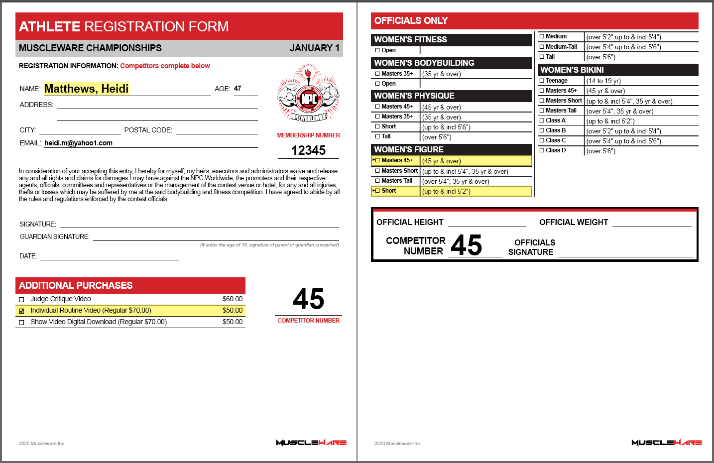 All Muscleware form headers contain context and location-aware IFBB Professional League, NPC/NPC Worldwide and/or CPA logos. Additionally, if you or your Promotion company has a logo you wish to include on your forms, let us know!