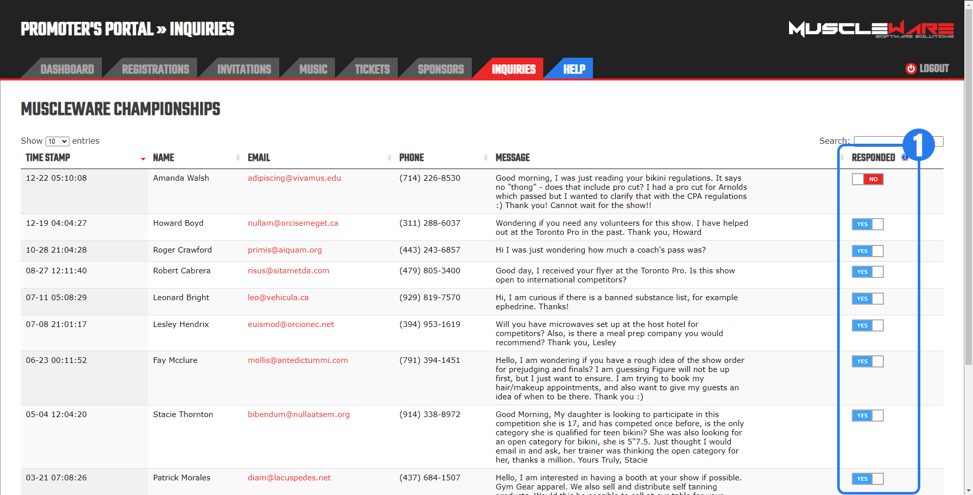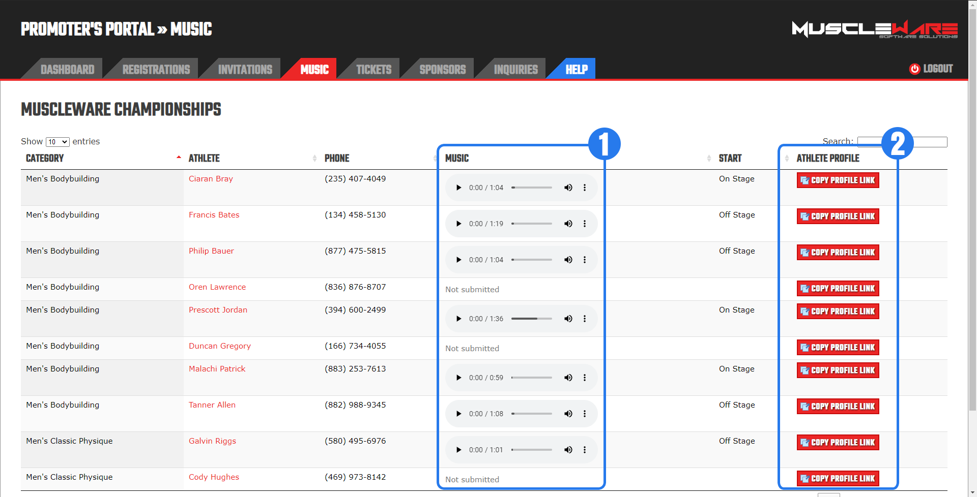 During the online registration period, Promoters can see who has uploaded their music (and who hasn't) in the Promoter's Portal, on the "MUSIC" tab. Additionally, if Athletes contact Promoters for posing routine music upload links (because they can't find or deleted their registration confirmation email), these links can be obtained in the Muscleware Promoter's Portal. See Section 4.4 above for more information.