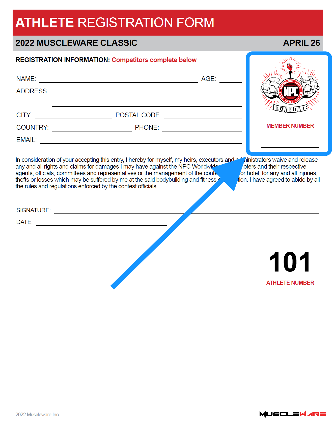 For "walk-up" Athletes, Muscleware provides a QR code, that Promoters can print and have available at check-ins for Athletes to scan, to sign their NPC wavier on-site. Alternatively, a blank PDF wavier is supplied that can be printed in case there are any Athletes that can't or won't use the QR code.