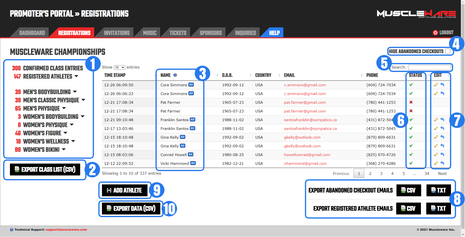 The Athlete List is provided as a Microsoft Excel file to Promoters to be archived and/or used for any purpose the Promoter sees fit. This list includes all Athlete names, email addresses and phone numbers.