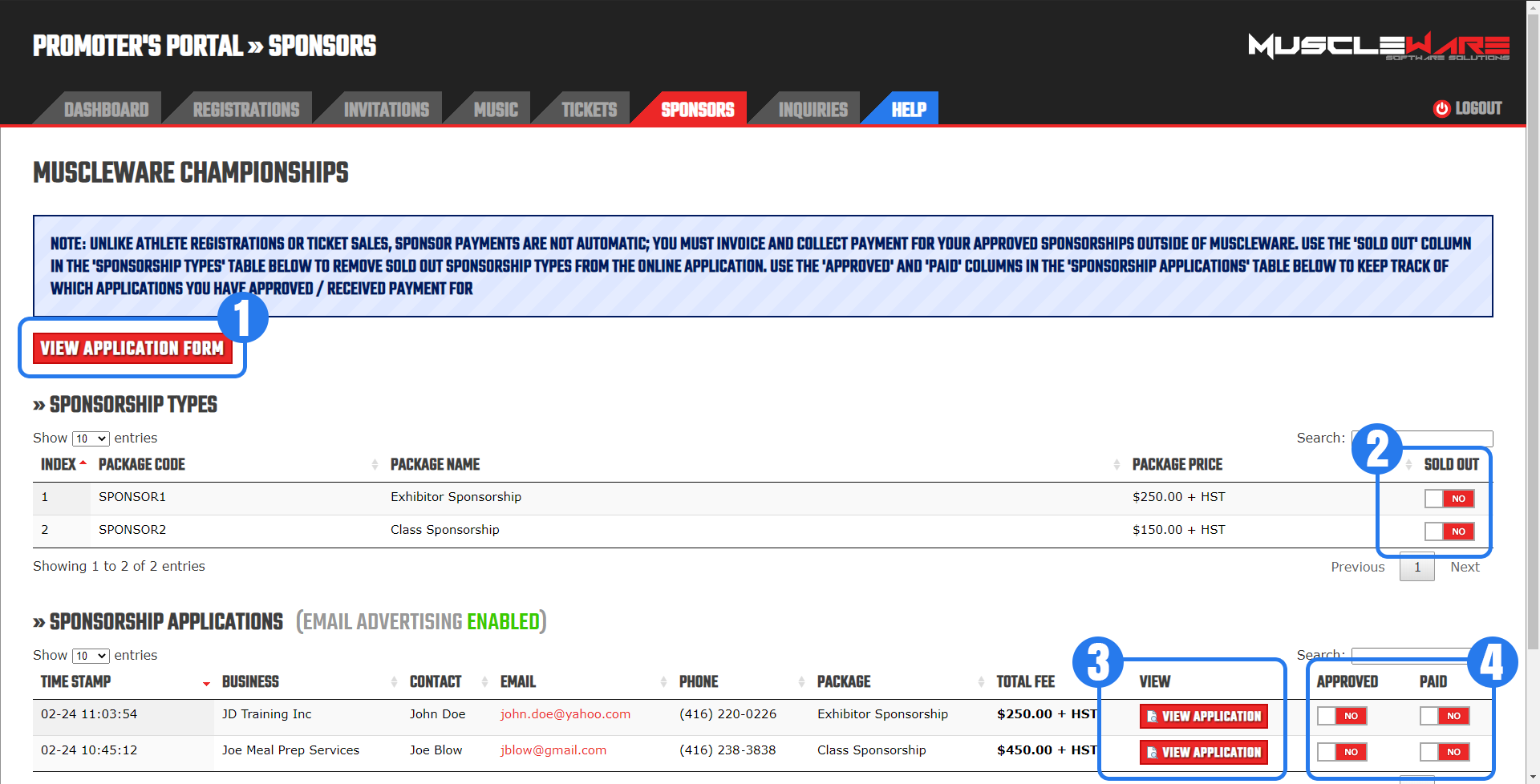 Additionally, where these payment gateways are unavailable or undesired, Muscleware provides a "Manual/External Payments" facility for Promoters to receive payment in any form, such as bank transfers, checks, cash, etc.