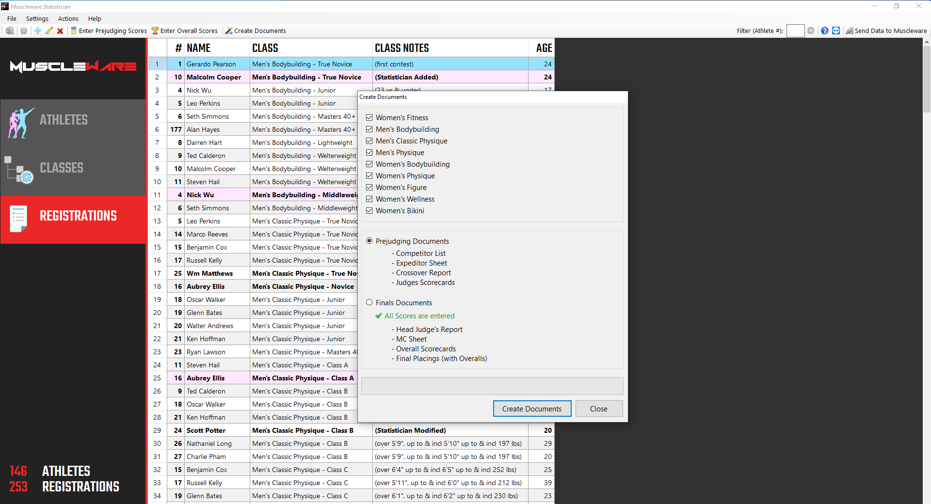 After Athletes are processed, Athlete Check-in sheets are given to the Statistician. The Statistician, using the Muscleware Statistician desktop software, can make any required adjustments to Athlete details and/or classes prior to generating all of the show day paperwork.