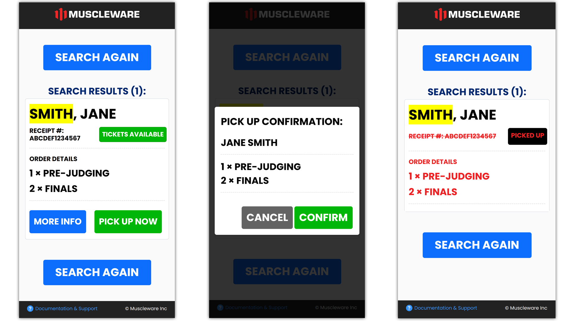 There is even an included Muscleware Ticket Staff Web App that your ticket staff members can use from their own mobile phones to scan ticket QR codes (or look up ticket holders by name) and record tickets as "PICKED UP".