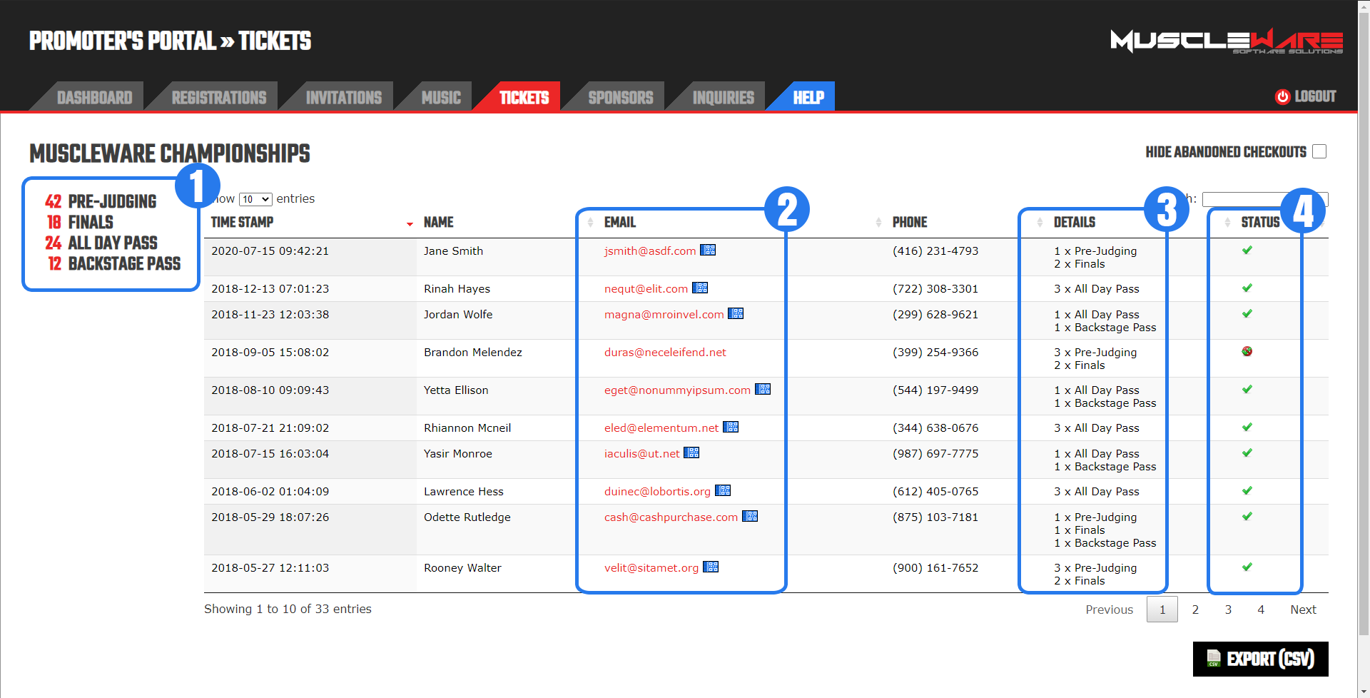 The "STATUS" column is of great importance, as it indicates the transaction status of the given row. Muscleware captures everything; even when Athletes fill out the registration form and abandon the checkout process before completing payment. All data may become useful for various purposes, so we record it all!