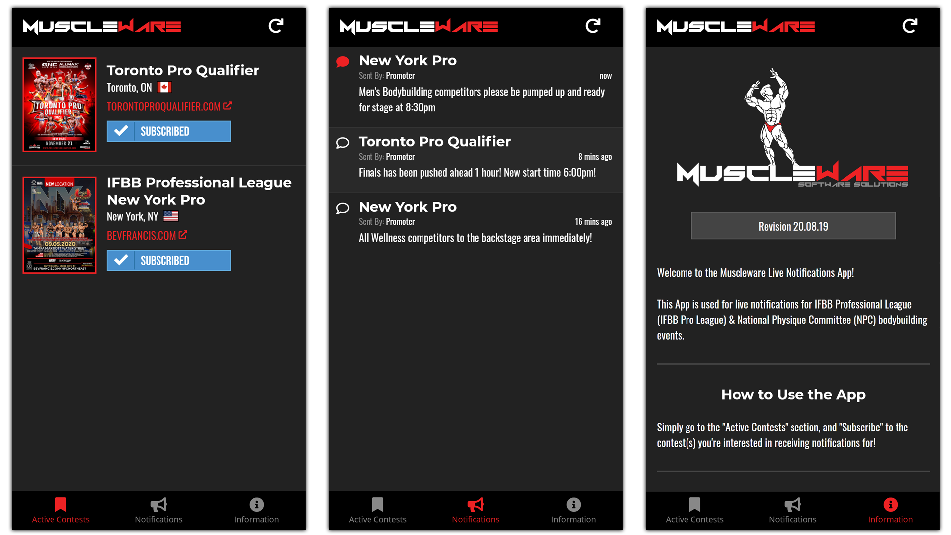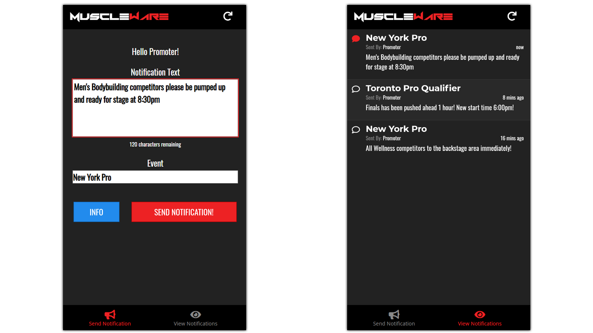 The Muscleware Live Notifications App is a show-day communications tool ideal for immediately notifying Athletes of schedule updates, special announcements, and any other messages Promoters want to get out to the Athletes (or even the Spectators, for that matter!).