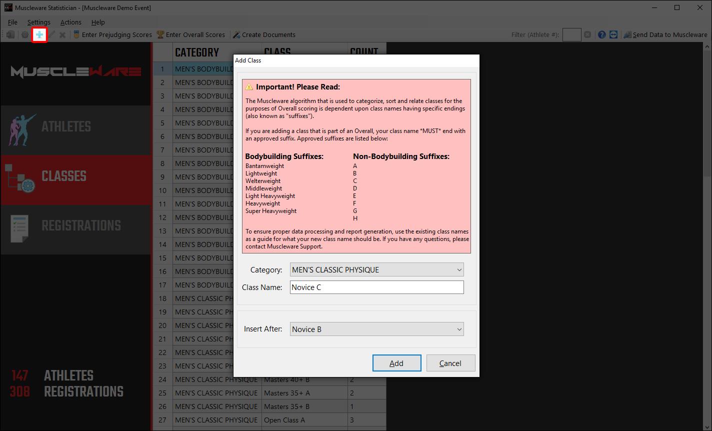 The legacy "CLASS NOTES" column has been removed from both the "CLASSES" area and the "REGISTRATIONS" area, and has been replaced by the new "ATHLETE NOTES" column. Athlete Notes are intended to be the officially measured height/weight of the Athlete. Athlete Notes are edited from the "Edit Athlete" dialog, and appear in the "REGISTRATIONS" area to provide a reference when editing Athlete Classes.