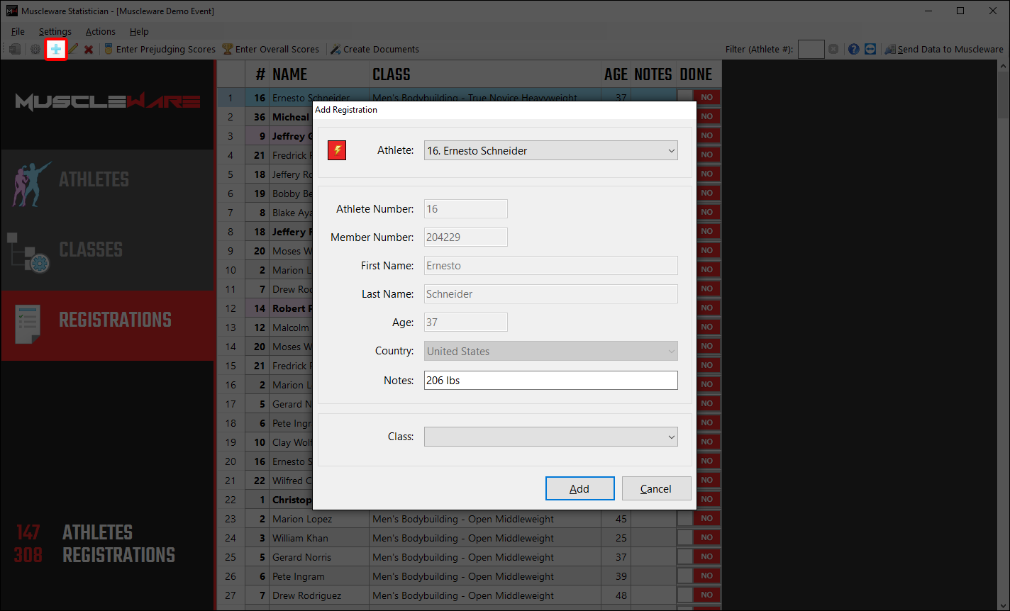 If an Athlete Number filter is being used, and 'Add Registration' is selected, the Registration editor automatically selects the filtered Athlete, so a class to add can be selected immediately.