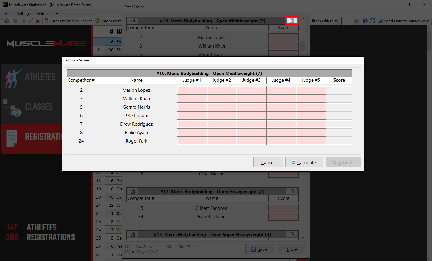Additionally, as the Muscleware Statistician Settings dialog states, if "Scoring Calculator" options are changed *after* Score calculations have already been made (for any Classes), you must return to the scored Class(es), re-load the Score Calculator and click "Calculate" to re-calculate the Scores for the Class(es). This must be done prior to generating the Finals Documents.