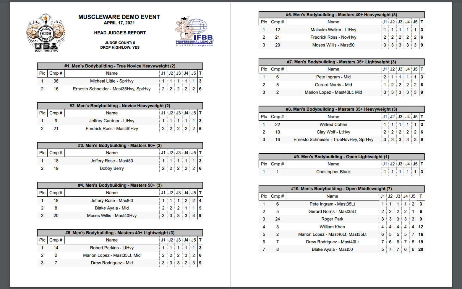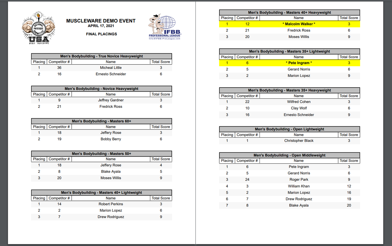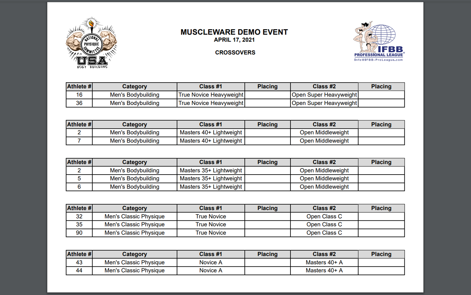 Muscleware Event Files are created with all kinds of intelligence built in. For instance, the file knows what organization the event has been sanctioned under (IFBB Professional League, NPC, NPC Worldwide, or CPA) and therefore what logo(s) to display on Created Documents.