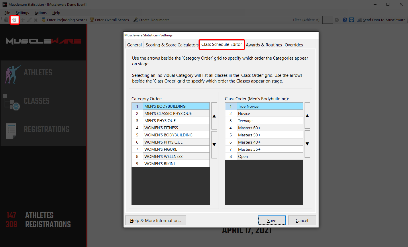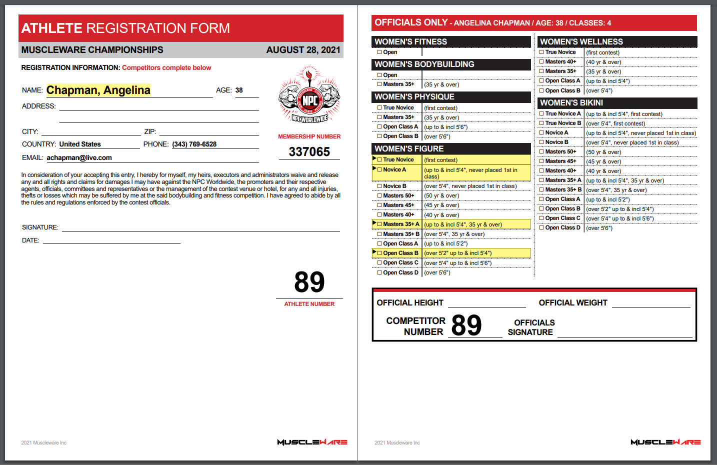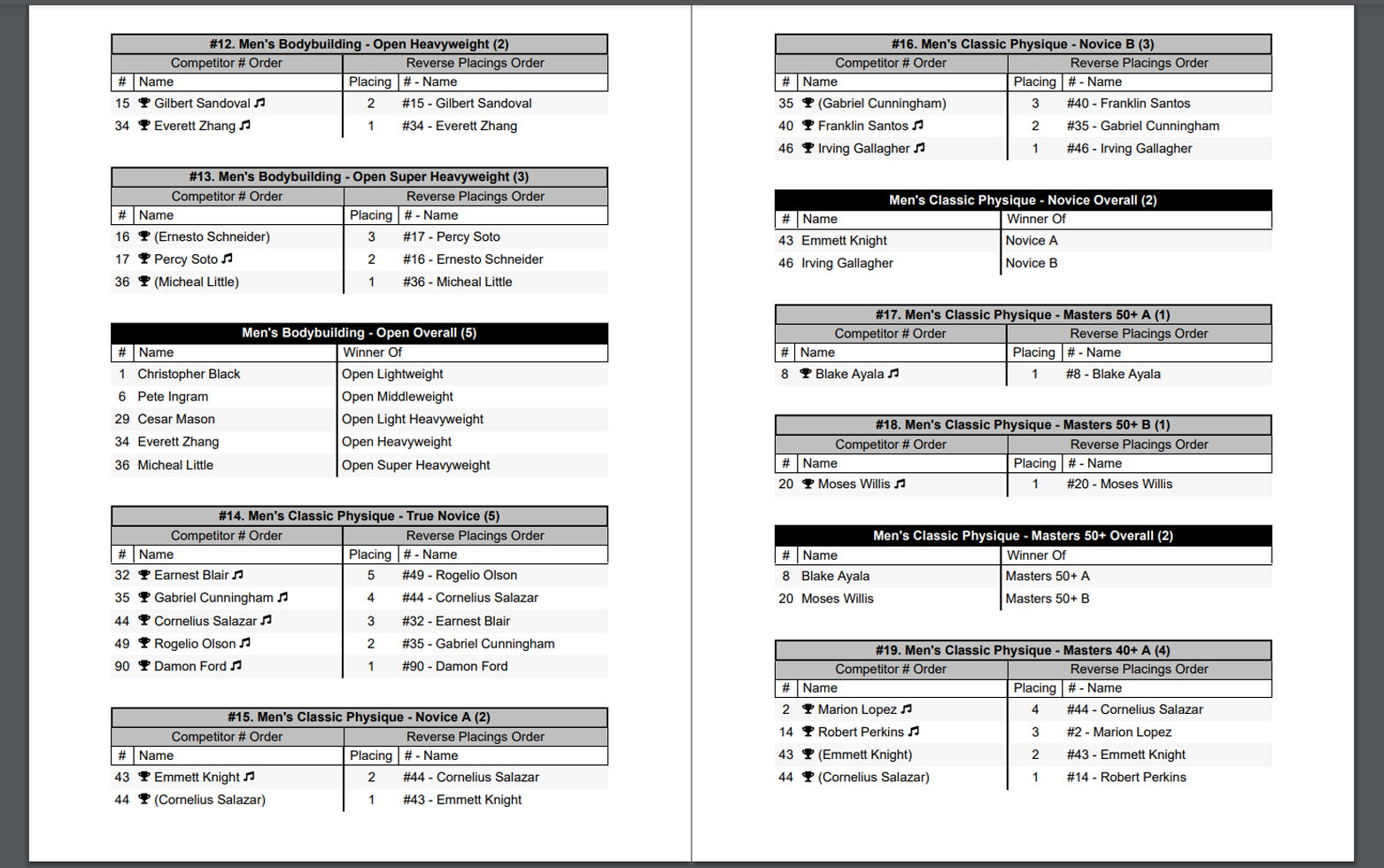 Muscleware Event Files are created with all kinds of intelligence built in. For instance, the file knows what organization the event has been sanctioned under (IFBB Professional League, NPC, NPC Worldwide, or CPA) and therefore what logo(s) to display on Created Documents.