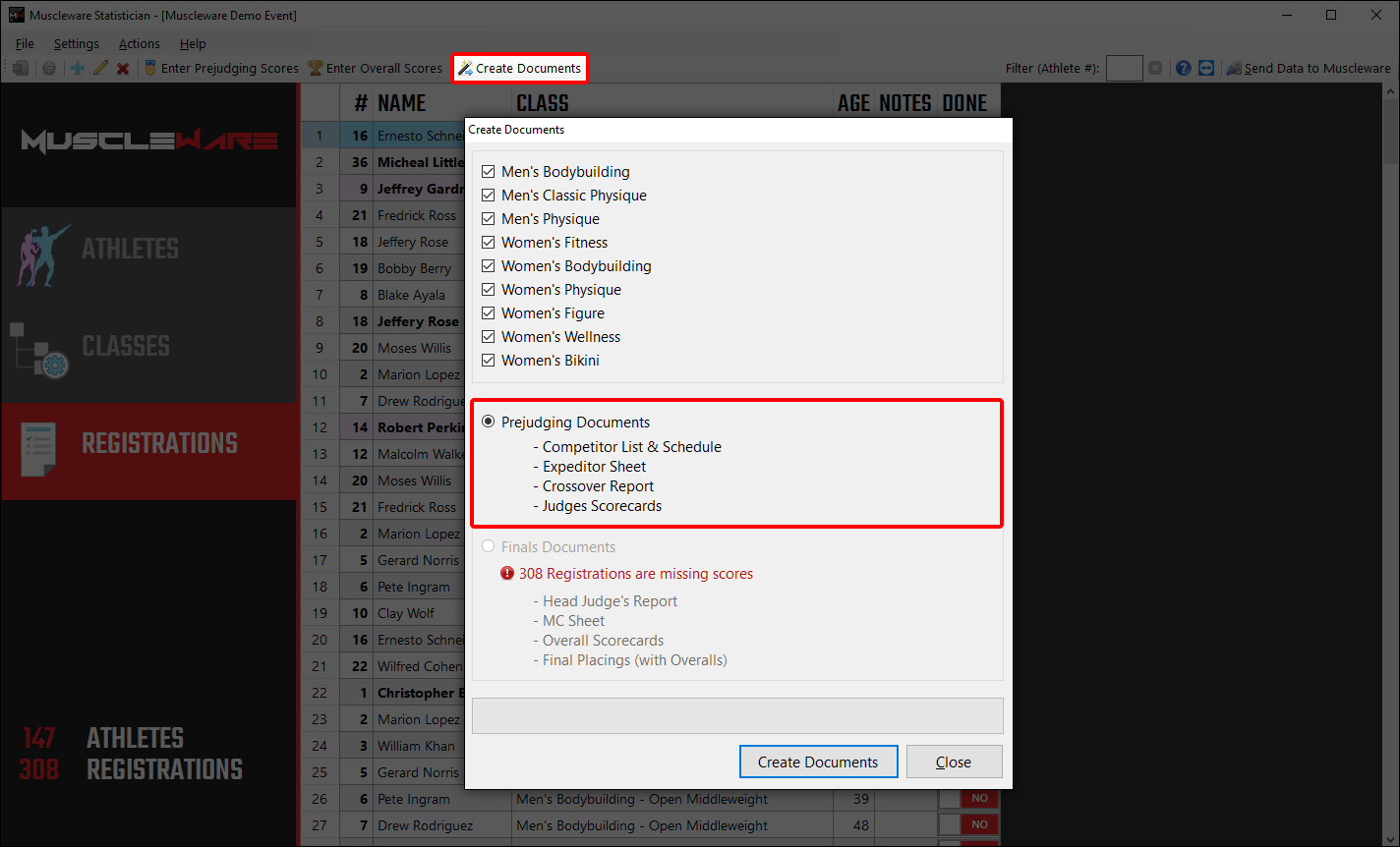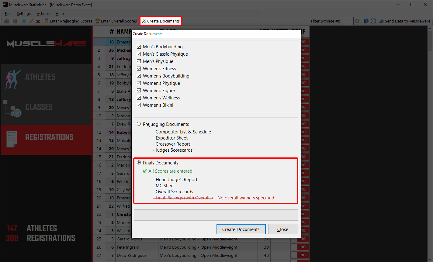 When 'Create Documents' is used (for NPC Worldwide or CPA events), the software checks to make sure all Athletes appearing in the Documents being created have Membership Numbers entered. As Membership Numbers are required to be entered/corrected prior to submitting final results via the 'Send Data to Muscleware' button, if any are missing while Documents are being Created, a warning dialog appears to notify the Statistician.