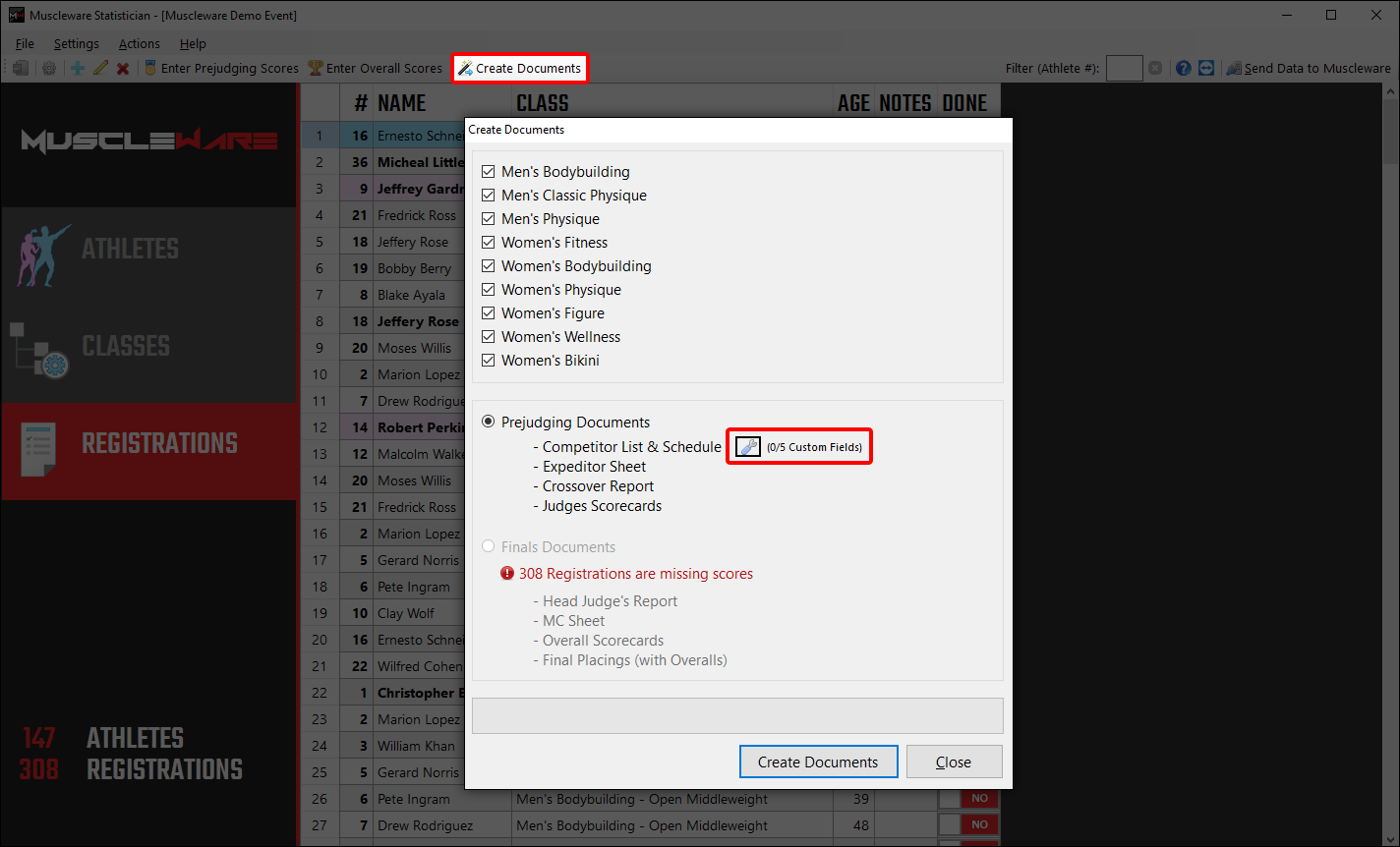 Athlete Bio Sheets - If Promoters have instructed Muscleware to collect custom/non-standard data on event entry forms (such as Occupation, Trainer Name, Gym, etc.), there is a selector in the "Create Documents" dialog that allows Statisticians to select the relevant data fields for inclusion on the Competitor List & Schedule. This document, if re-generated for the Finals portion of the show, can be used as a supplemental document to the MC Sheet, allowing the MC to make personalized Athlete announcements. For more information, see Section 6.5.3