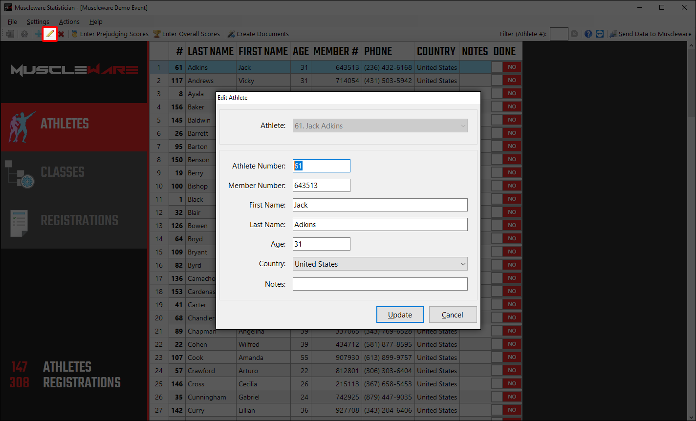 Edit dialogs for the "ATHLETES", "REGISTRATIONS", and Statistician-defined "CLASSES" can be accessed by simply 'double-clicking' the rows.