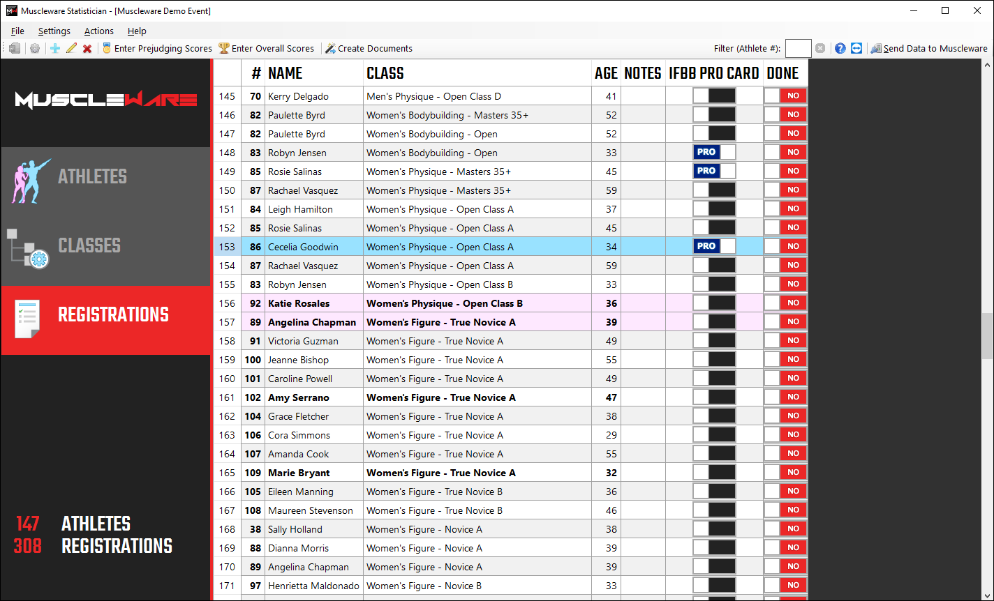 Event files are also aware of their level of competition (Regional, Pro Qualifier, Pro), and defaults to different settings and provides different options for them. Pro Qualifying events default to 7 Judges, for example, while Regional events default to 5 Judges. International events enable NPC Worldwide Competitor Certificates to be generated, and more.