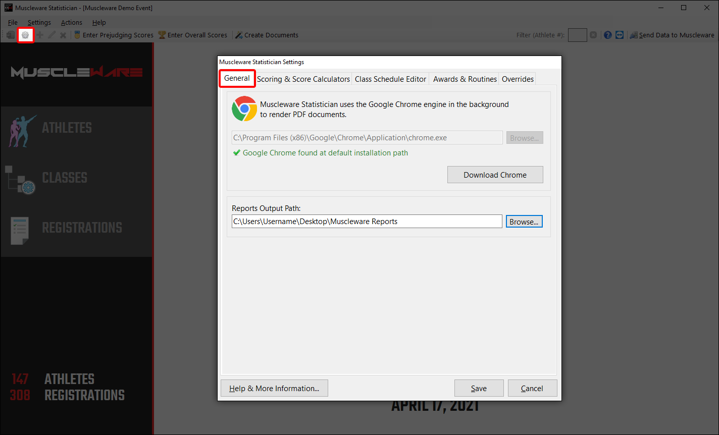 As mentioned in Section 2.2, Muscleware Statistician uses the Google Chrome engine for rendering PDF documents. All Event documents created by Muscleware Statistician are created in PDF format, allowing perfect, crisp printing to provide the highest level of polish and professionalism.