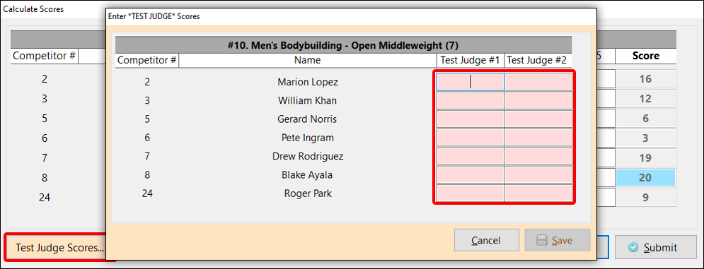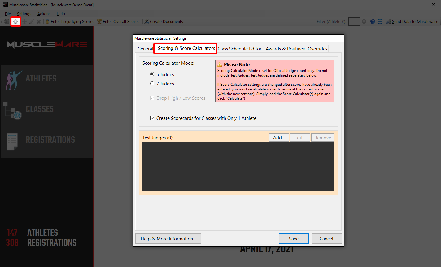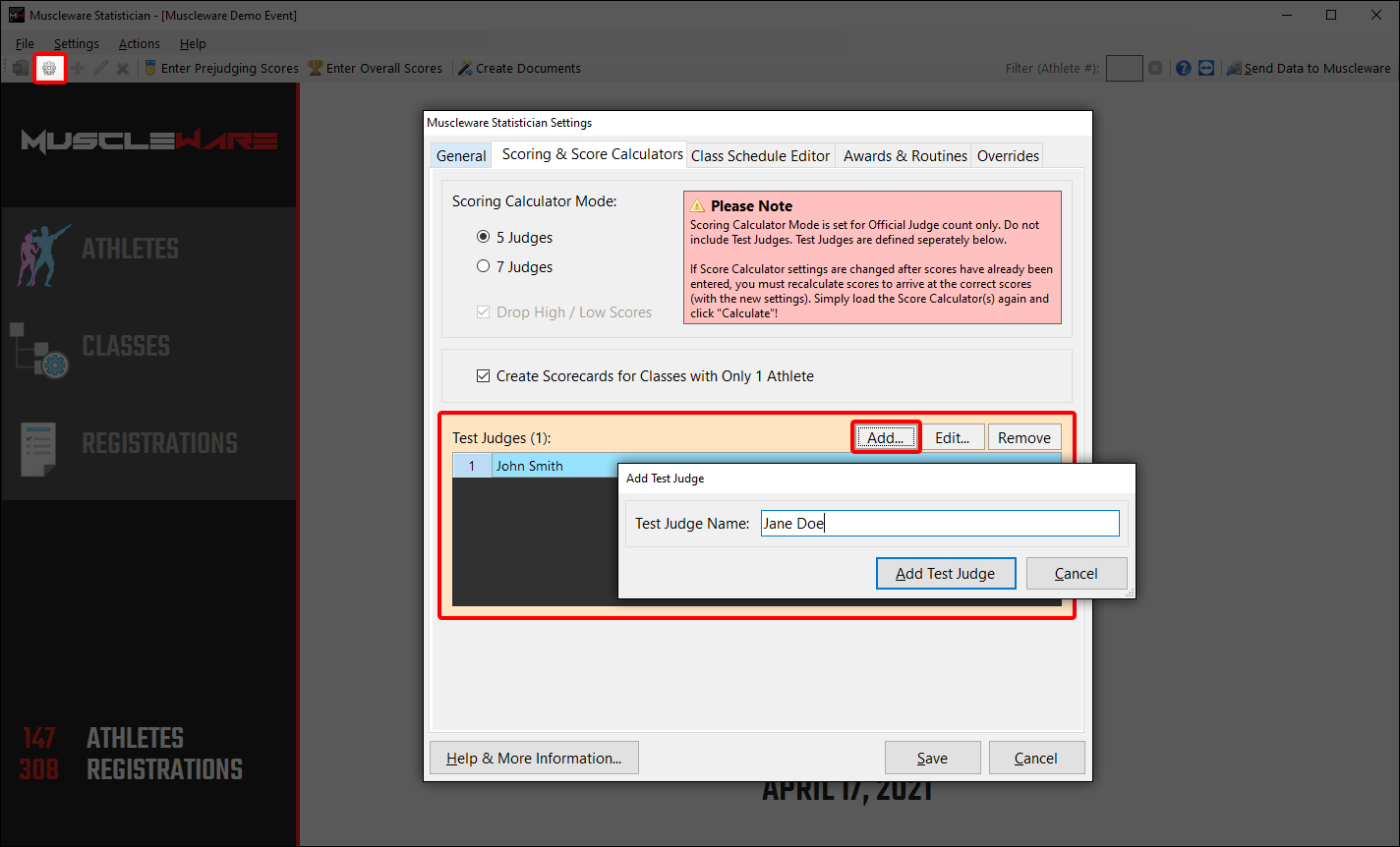 Each Test Judge must be defined in the Event File in order for the software to provide the necessary score entry fields for this data. Test Judge configuration can be found on the "Scoring & Score Calculators" tab of the "Settings" dialog: