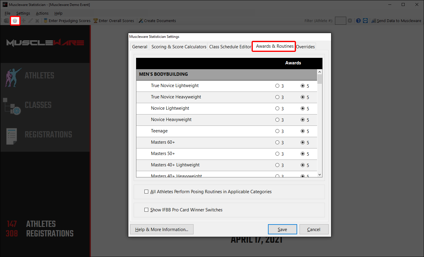 "All Athletes Perform Posing Routines (in Applicable Categories)" checkbox added in the "Settings" dialog ("Awards & Routines" tab) that augments the MC Sheet to respect whether only the top 3 or 5 Athletes perform posing routines, or whether the Head Judge or Promoter has opted to allow all Athletes to perform their Posing routines once.