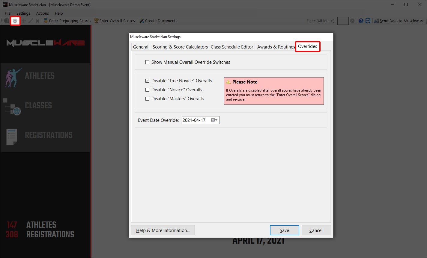"Manual Overall Override Switches" have been added to the "REGISTRATIONS" area, and are shown/hidden by way of a checkbox on the "Scoring & Score Calculators" tab of the "Settings" dialog. These switches allow the Statistician to specify additional overall winners, on top of what the software calculates based on overall scores. For more information, see Section 6.6.1.