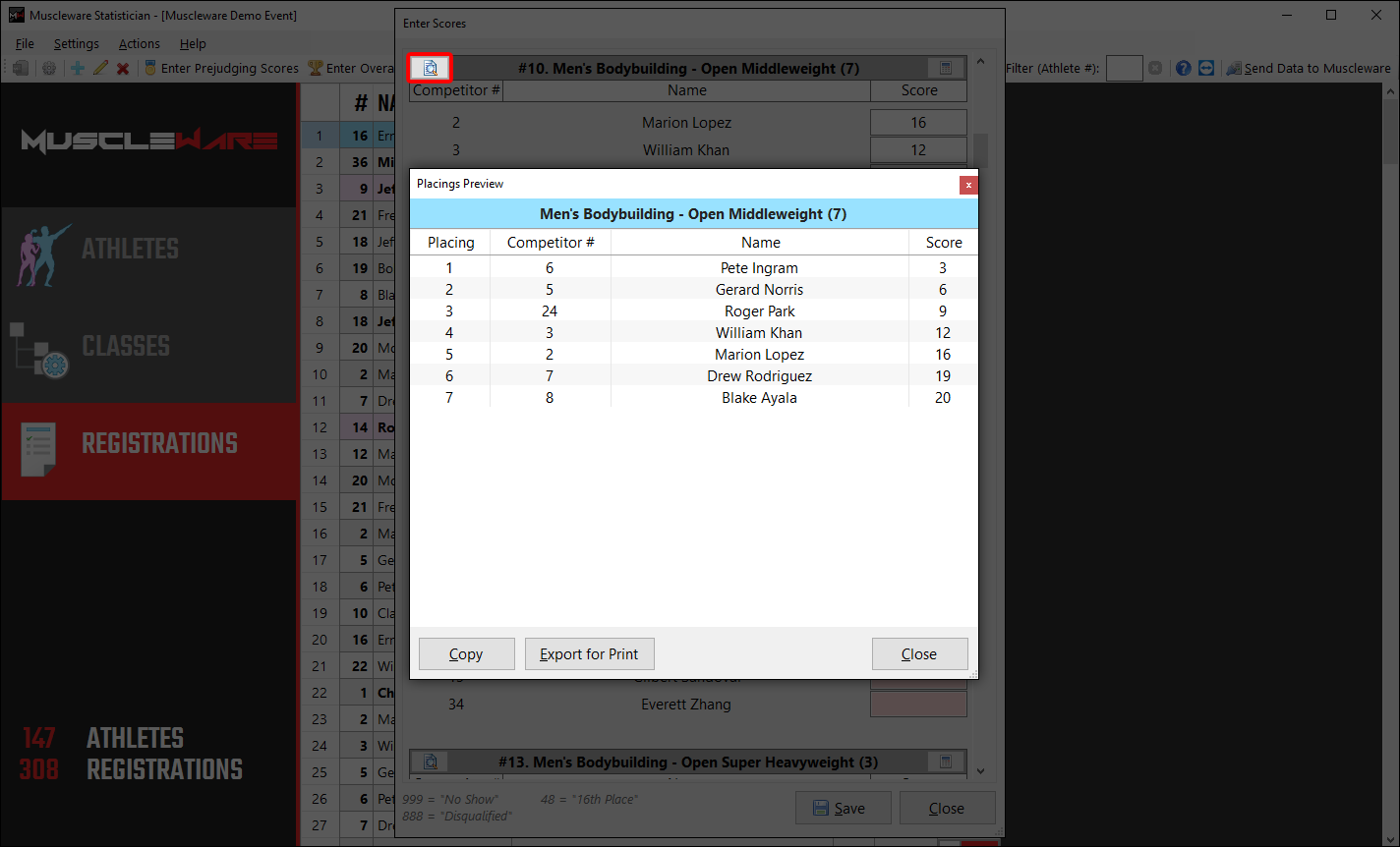 The "Placings Preview" dialog now has an "Export for Print" button that immediately creates a printable PDF of the current class placings.