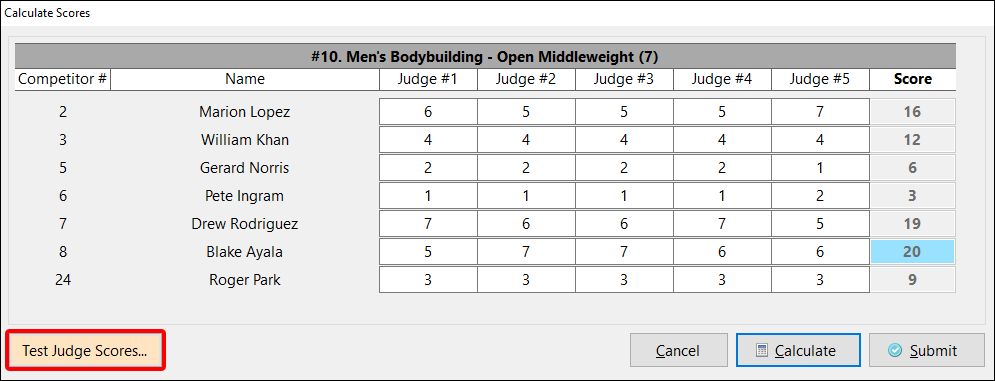 Updated IFBB Pro League / NPC Fitness Scoring procedure and calculations are now supported. In the 'Enter Prejudging Scores' dialog, there are two calculators - one for Round 1 (Two Piece), and a second for Round 2 (Routine). Only when both rounds are entered and calculated will the Prejudging scores be calculated and weighed, per NPC specification.